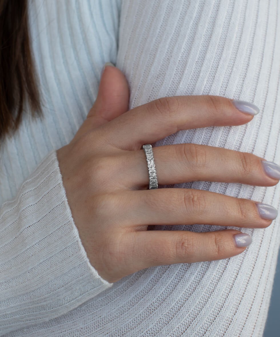 Окремої уваги заслуговує дизайн даної каблучки. Вставки з кубічного цирконію різних форм — круглих та багетних — розташовані асиметрично, створюючи унікальний і неповторний ефект. Така композиція додає прикрасі сучасного вигляду, а гра світла на камінцях робить її ще більш привабливою. Завдяки витонченому поєднанню гладкого срібла та сяючих каменів, каблучка виглядає стильно й елегантно, гармонійно доповнюючи будь-який образ.