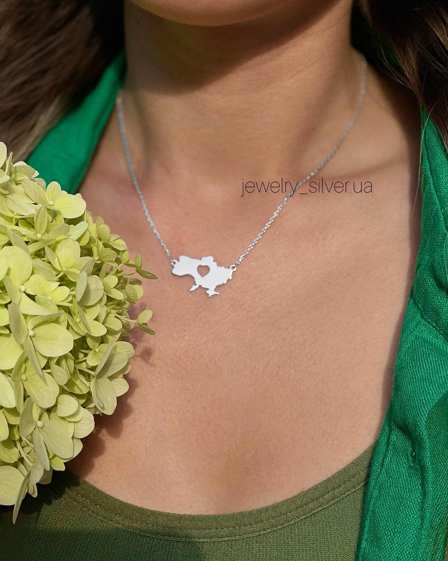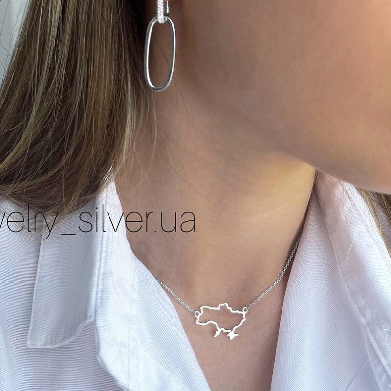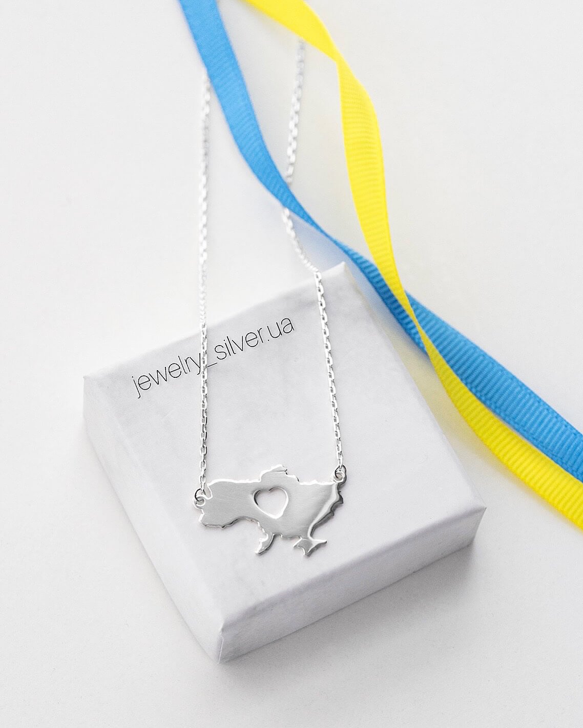Увагу оточуючих привертає кулон у формі карти України. Всередині виробу вирізане серце, що створює певний символізм: Україна завжди буде у серці власниці кулона. Ніжне кольє чудово поєднується з різним одягом: