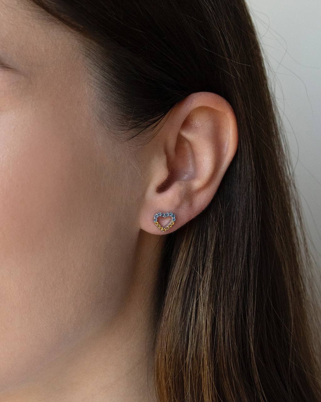 Срібні сережки «Серце» з жовтим і синім камінням