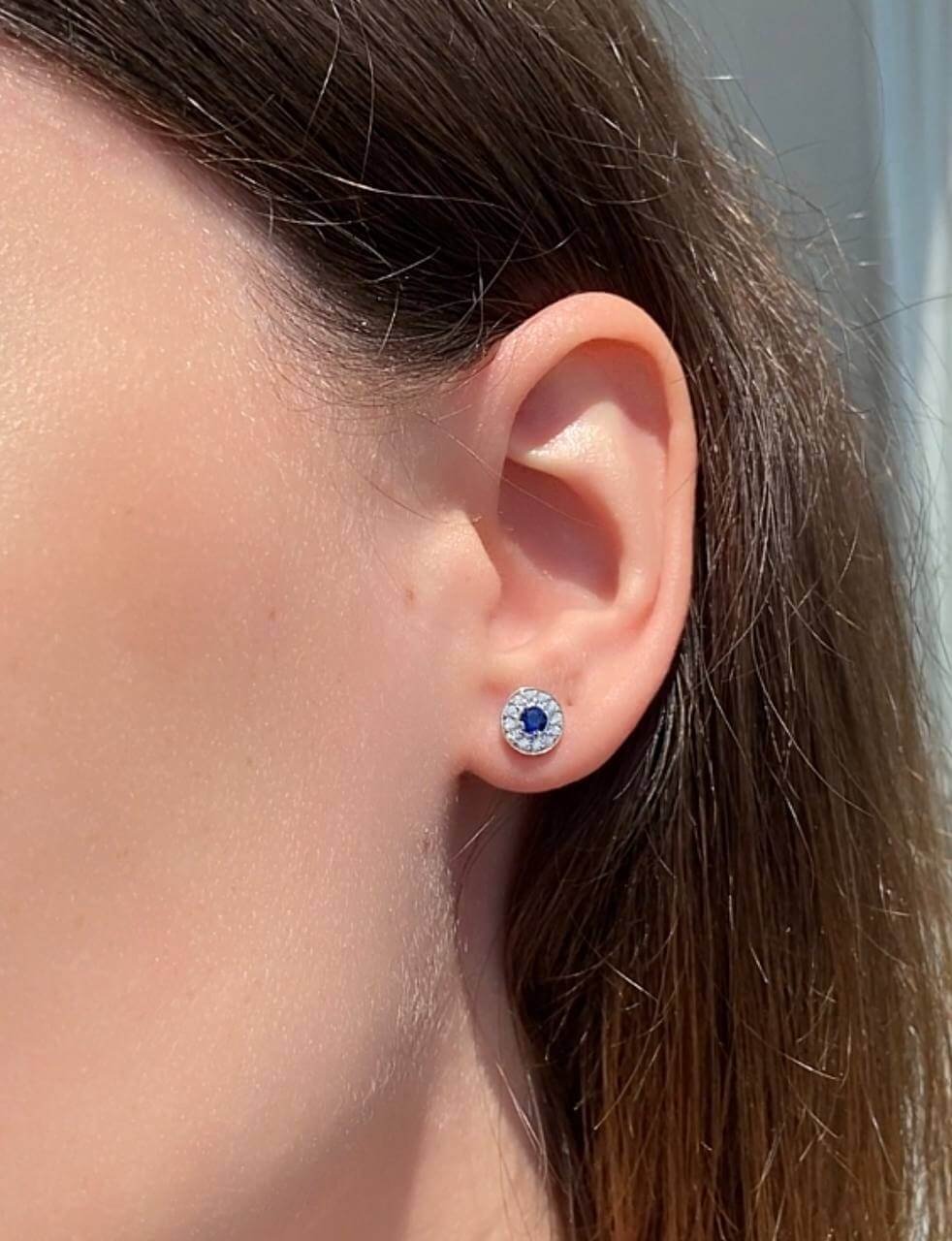 Маленькі акуратні сережки підходять для носіння кожен день. Невеликий розмір прикраси (8 мм) дозволяє носити її дівчаткам та дорослим жінкам. Попри лаконічність сережок, вони притягують до себе погляди завдяки переливам каміння з кубічного цирконію. В центрі виробу розміщений синій камінь, а обрамлення виконане з прозорих камінців.