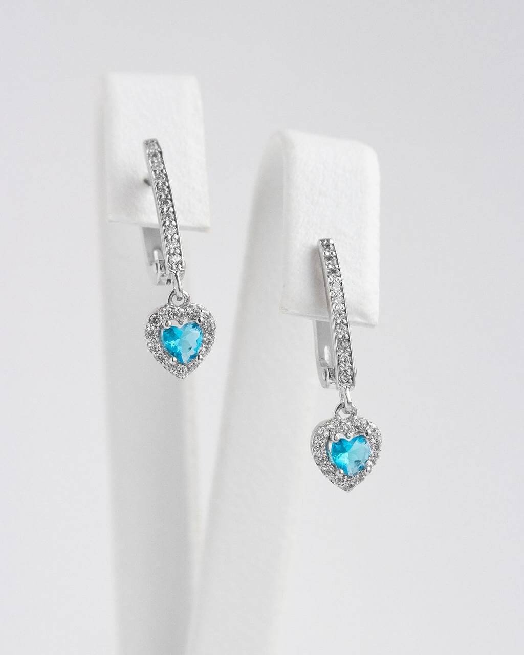 Срібні сережки, доповнені блакитним і прозорим камінням, втілюють витонченість та елегантність. Прикраса виготовлена зі срібла високої 925 проби. Для захисту від корозії метал додатково покритий шаром родію. Виріб не боїться вологи чи контакту зі шкірою. Камінці міцно прикріплені до основи, тому не можуть відколотися під час падіння.