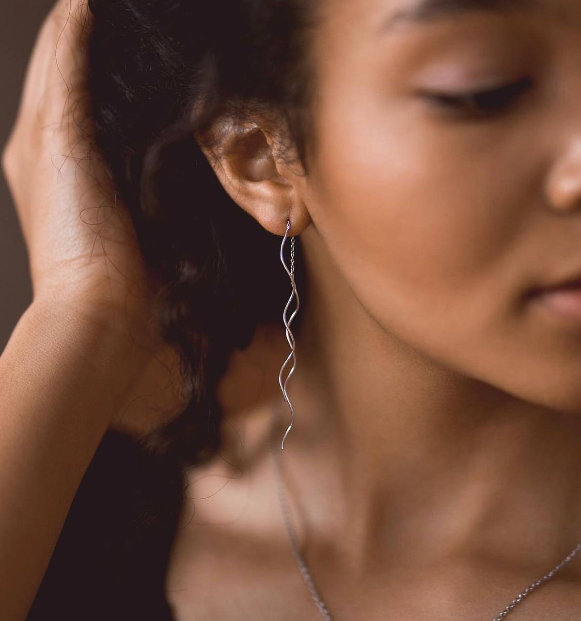 Елегантні та лаконічні сережки у формі легких хвиль стануть окрасою будь-якого образу. Вони підходять до вечірніх суконь, ділових образів та повсякденного одягу. Завдяки довгій формі сережки пасують жінкам з різними формами облич. Прикраса відмінно «збалансує» круглі та серцевидні обличчя. Частина сережки виконана у формі ланцюга з якірним типом плетіння.