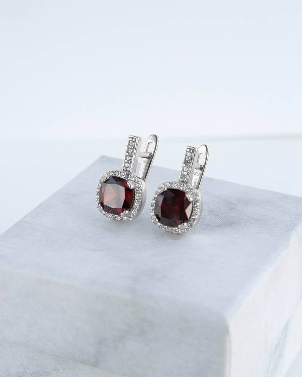 Срібні сережки з темно червоним камінцем