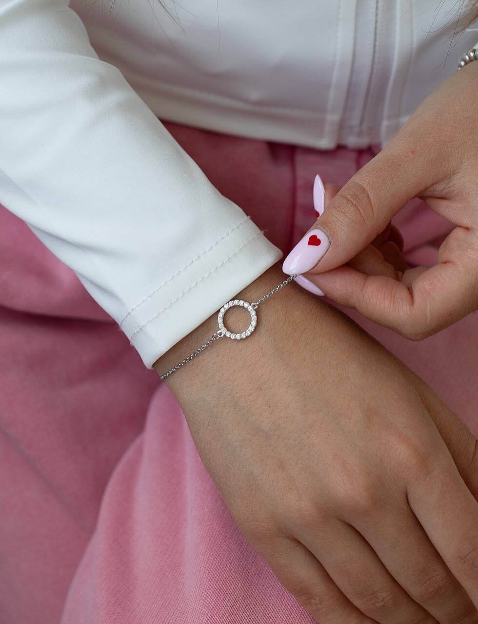 Окремої уваги заслуговує круглий елемент, прикрашений дрібним кубічним цирконієм. Камінь дуже міцний та відмінно розсіює сонячне світло. Прикраса привертатиме увагу оточуючих. Браслет чудово поєднується з кольє та сережками у такому ж стилі. Прикраса стане бажаним подарунком з кількох причин: